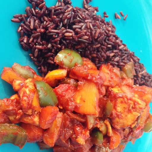 Dit maal heb ik het geserveerd met zwarte rijst. Als je er rijst bij wilt serveren is het handig voordat je begint met het snijwerk je een pan met water op zet en de rijst hier vast in laat koken zodat de saus en de rijst tegelijk klaar is! Geniet ervan.