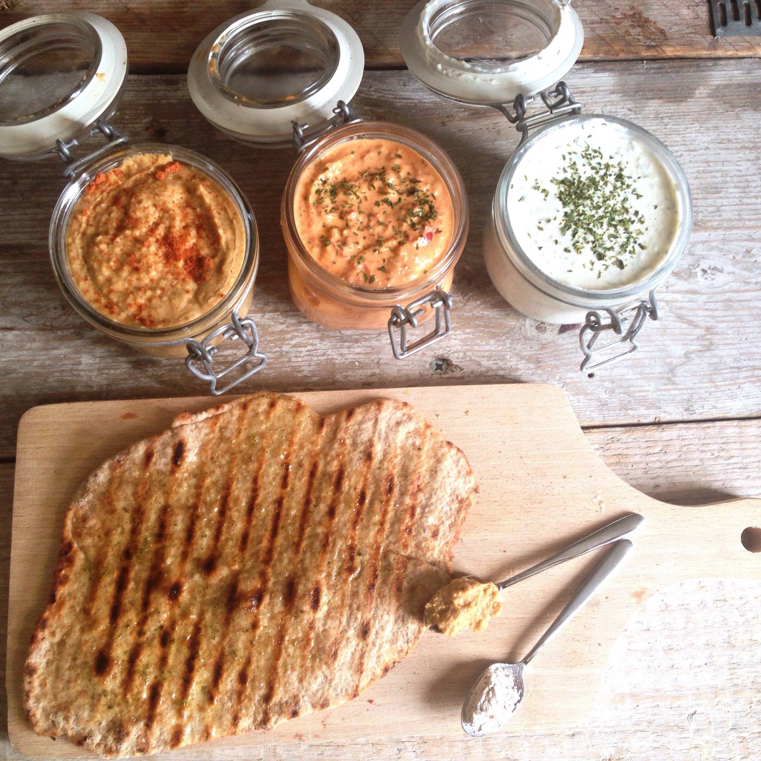 Snijd het naanbrood daarna in dunne plakken en leg op een broodplank met diverse dips, zoals tzatziki of feta paprikadip Genieten maar!