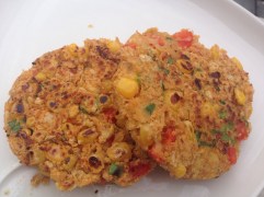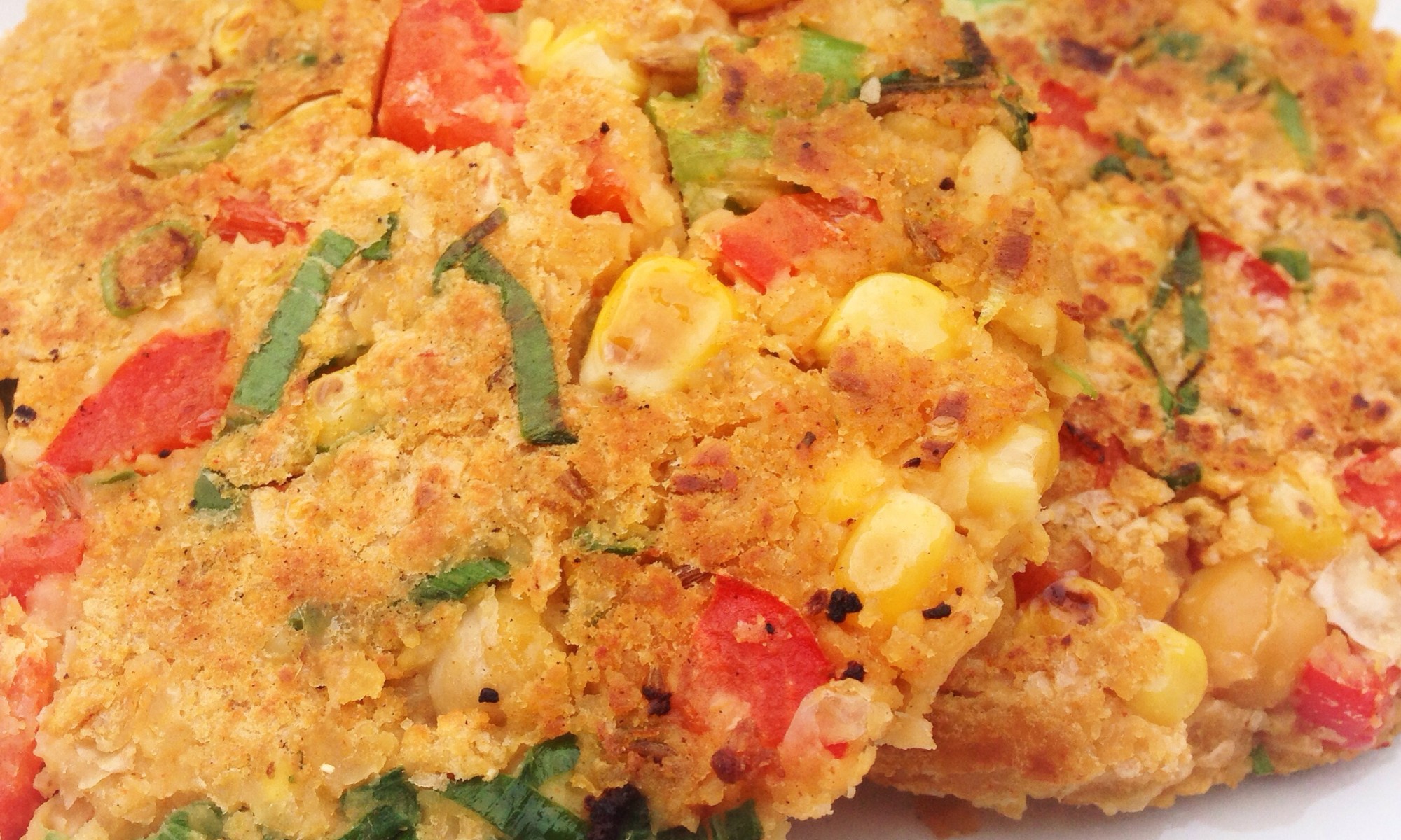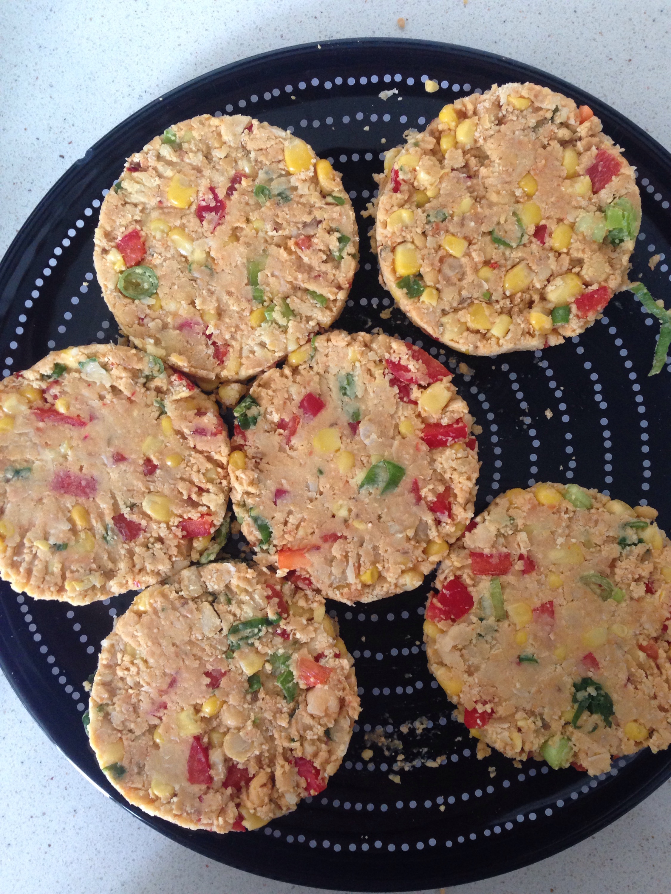 Laat de mais uitlekken en voeg dit samen met de paprika en bosui aan de kikkererwten toe. Roer het goed door. Voeg de sambal en de kruiden toe en als laatste de paneermeel.