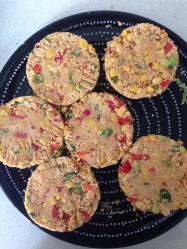 Verdeel het mengsel in zessen, het kan ook in vieren dan worden ze wat groter. Maak er platte ronde burgers van, gebruik eventueel een ijzeren ring met een stamper, zie foto.
