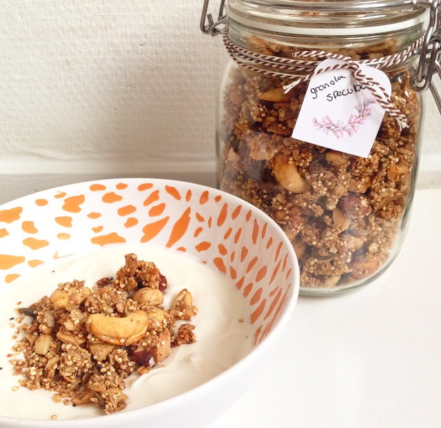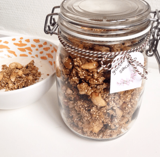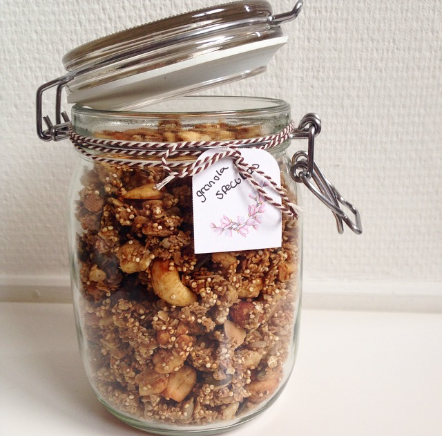 Verdeel de massa op een bakplaat met bakpapier. Verdeel het en plaats het in de oven voor ongeveer 15 a 20 minuten. Roer tussendoor een beetje om. Haal de bakplaat eruit en laat het afkoelen. Plaats het in een schone weckpot en je hebt heerlijke speculaas granola voor een paar weken! Ligt natuurlijk eraan hoeveel je het gebruikt :-)