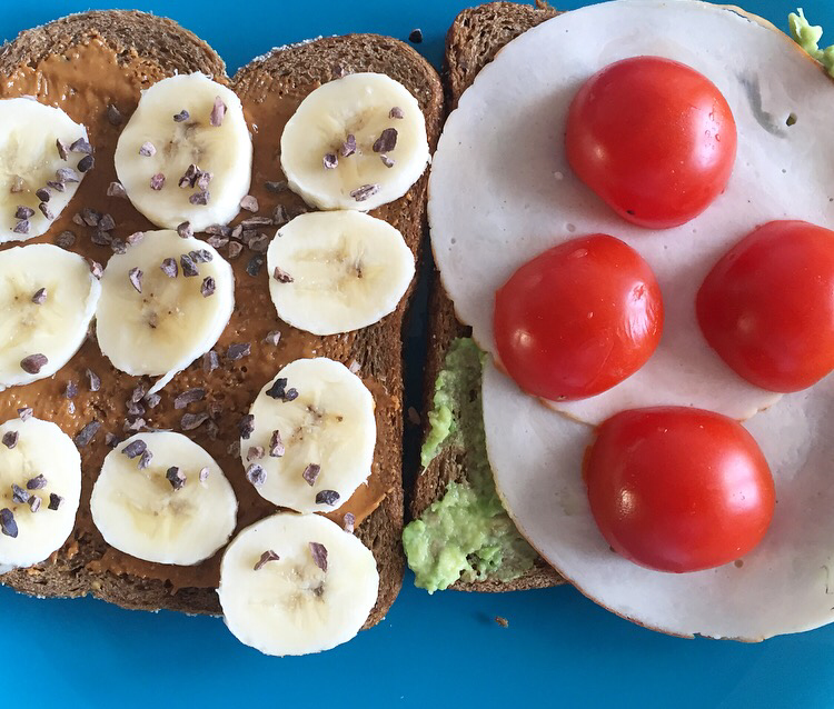 Eén boterham besmeer je met pindapasta van Body en Fit shop (andere is ook prima), daarop leg je plakjes banaan en strooi je er wat cacaonibs over. De andere boterham besmeer je met avocado (prak eerst in een bakje de avocado zodat je het kan smeren op de boterham), leg er twee plakjes kipfilet en snijd de cherry tomaatjes door de helft en leg dit erboven. Eventueel op smaak met wat peper.