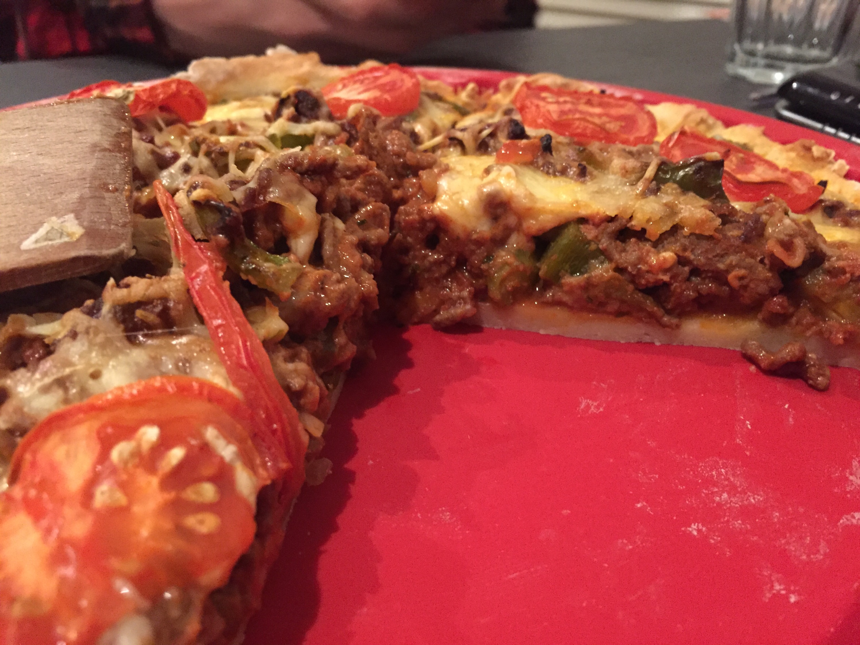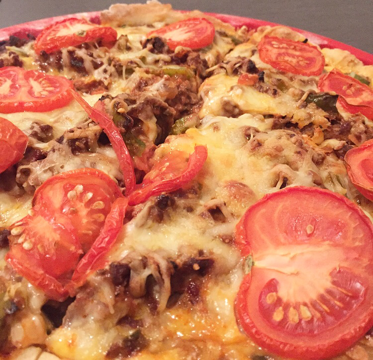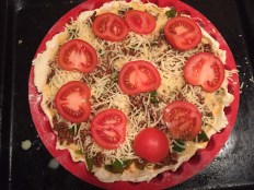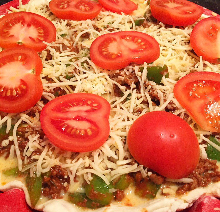 Haal het deeg uit de koelkast en verder de gehakt vulling, druk goed aan. Verdeel het ei mengsel over het gehakt d.m.v. Een lepel of sauslepel. Strooi er een beetje geraspte kaas over en als laatste een paar plakjes tomaat.