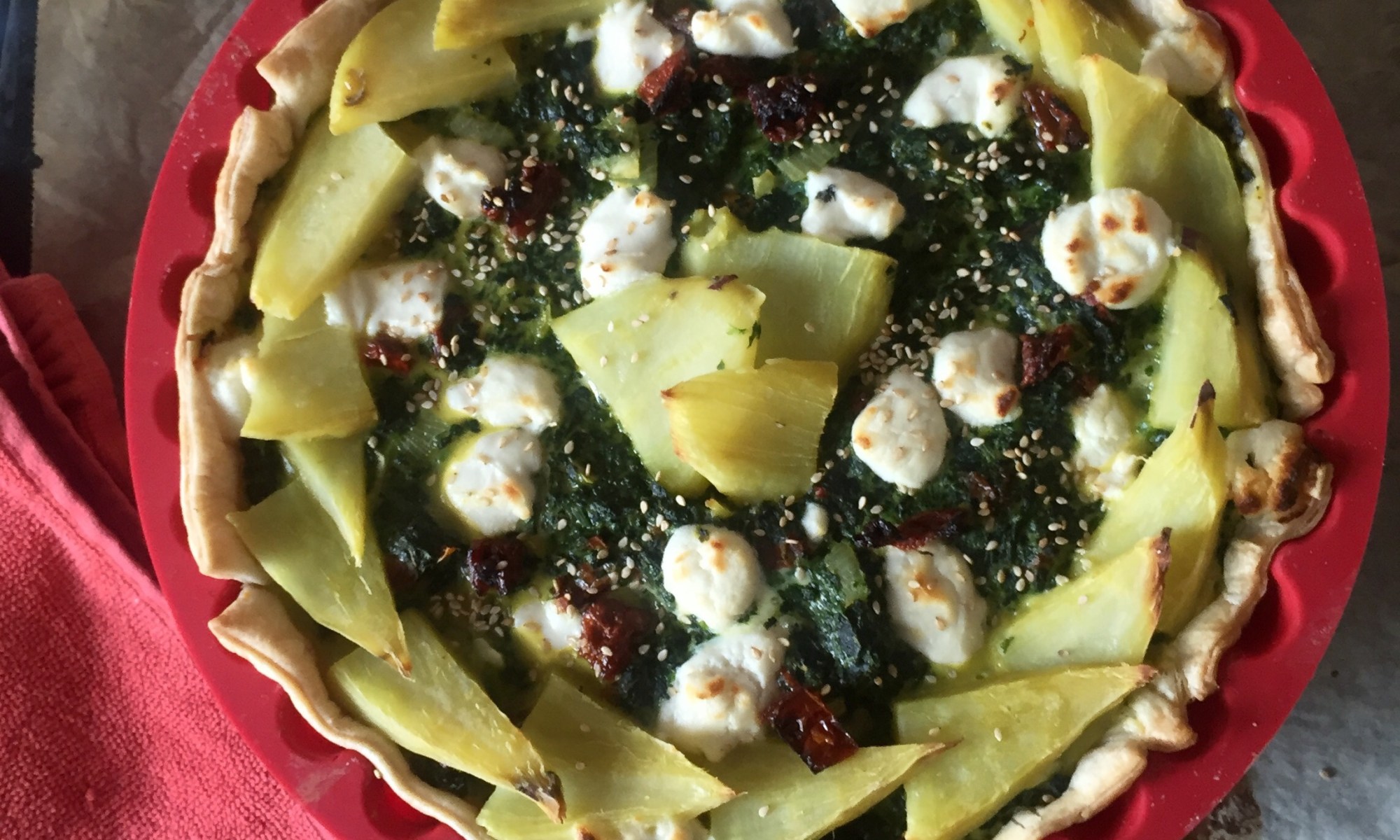 Haal het plastic van de plakjes bladerdeeg en vul de bodem hiermee. Ik gebruik een ronde flexibele vorm, ideaal voor de oven maar je kan ook een andere platte vorm gebruiken. Snijd 8 zongedroogde tomaatjes klein en roer dit door de spinazie heen. Verdeel daarna het spinazie mengsel over de bladerdeeg bodem. Klop 3 eieren los in een kommetje en giet dit over de spinazie, let op; niet te snel en verdeel het goed. Je kan eventueel met de vork het ei nog een beetje verdelen.