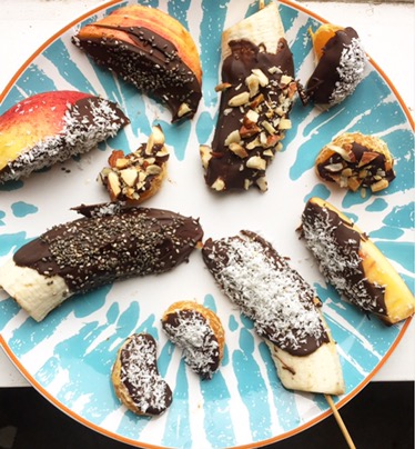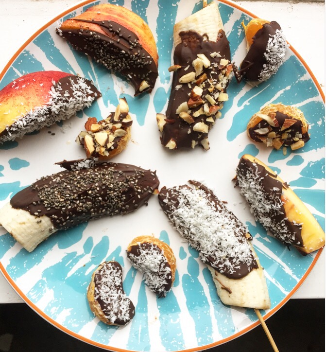 Snijd ondertussen het fruit, prik er een saté prikker in of een kleine olijf prikker. Zet de dips klaar. Als de chocolade gesmolten is doe je met een pannenlikker of kleine lepel de chocolade over het fruit heen. leg het op een bord en strooi er een dip naar keuze overheen.