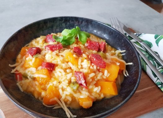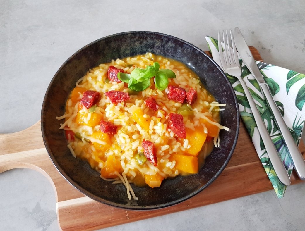 Herfst risotto met pompoen en chorizo
