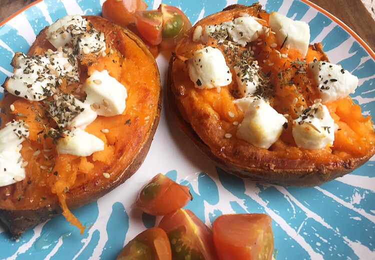 Leg de zoete aardappel op een bakplaat met bakpapier. De schil naar boven. Plaats het in de oven voor ongeveer 30 minuten. Haal de plaat eruit, prik de binnenkant beetje los met een vork, leg daar de geitenkaas stukjes op, strooi de sesamzaadjes en Italiaanse kruiden erop en plaats nog 10 minuten terug in de oven.