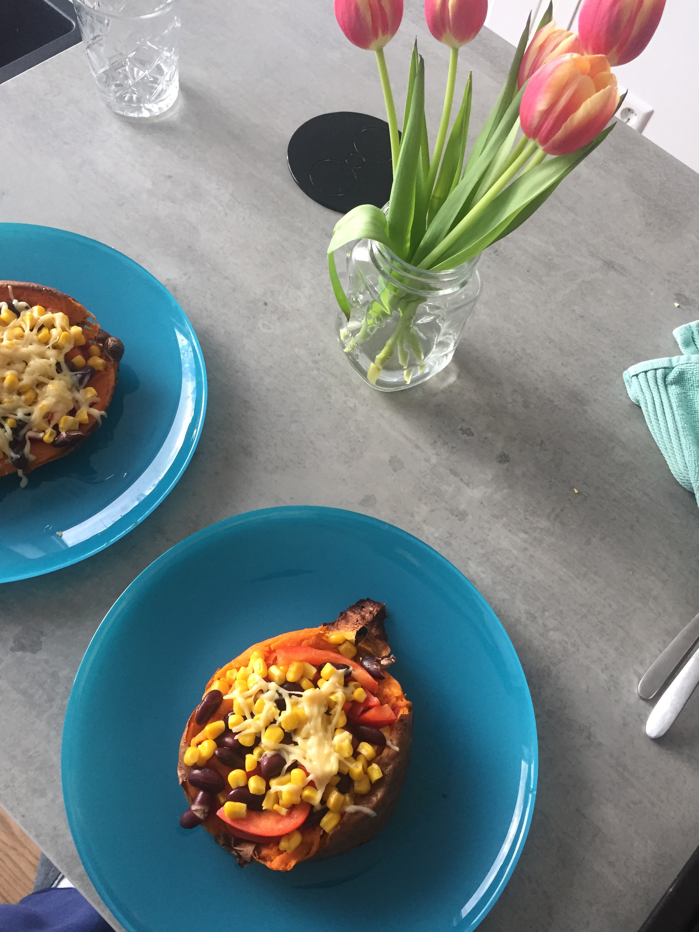Serveer de zoete aardappel met wat crème fraiche! Zelf heb ik er een paar gehakt balletje bij geserveerd maar je kan ook wat gehakt rullen en ook over de zoete aardappel strooien!