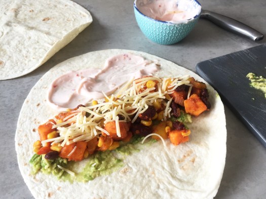 Leg de tortilla’s op het aanrecht. Smeer per tortilla wat kwarksaus uit, ook een beetje avocado en leg daarop de zoete aardappel vulling. Rol de wrap op en leg in een ovenschaal. Doe dit bij alle 4 de tortilla’s. Plaats de ovenschaal in de oven voor ongeveer 10 minuten, je kunt eventueel wat geraspte kaas eroverheen strooien.