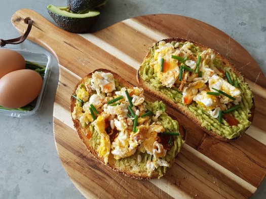 Toast avocado met roerei, een gezonde en voedzame lunch. Avocado heeft een cholesterol verlagende werking, zorgt voor een mooie huid, verlaagt je eetlust, reguliert je bloedsuikerspiegel en bevat behoorlijk wat vitamines en mineralen. Ondanks avocado calorierijk is, is het dus zeker de moeite waard om regelmatig avacado te eten! Zelfs als je bezig bent met afvallen is avocado alsnog een goede keuze.