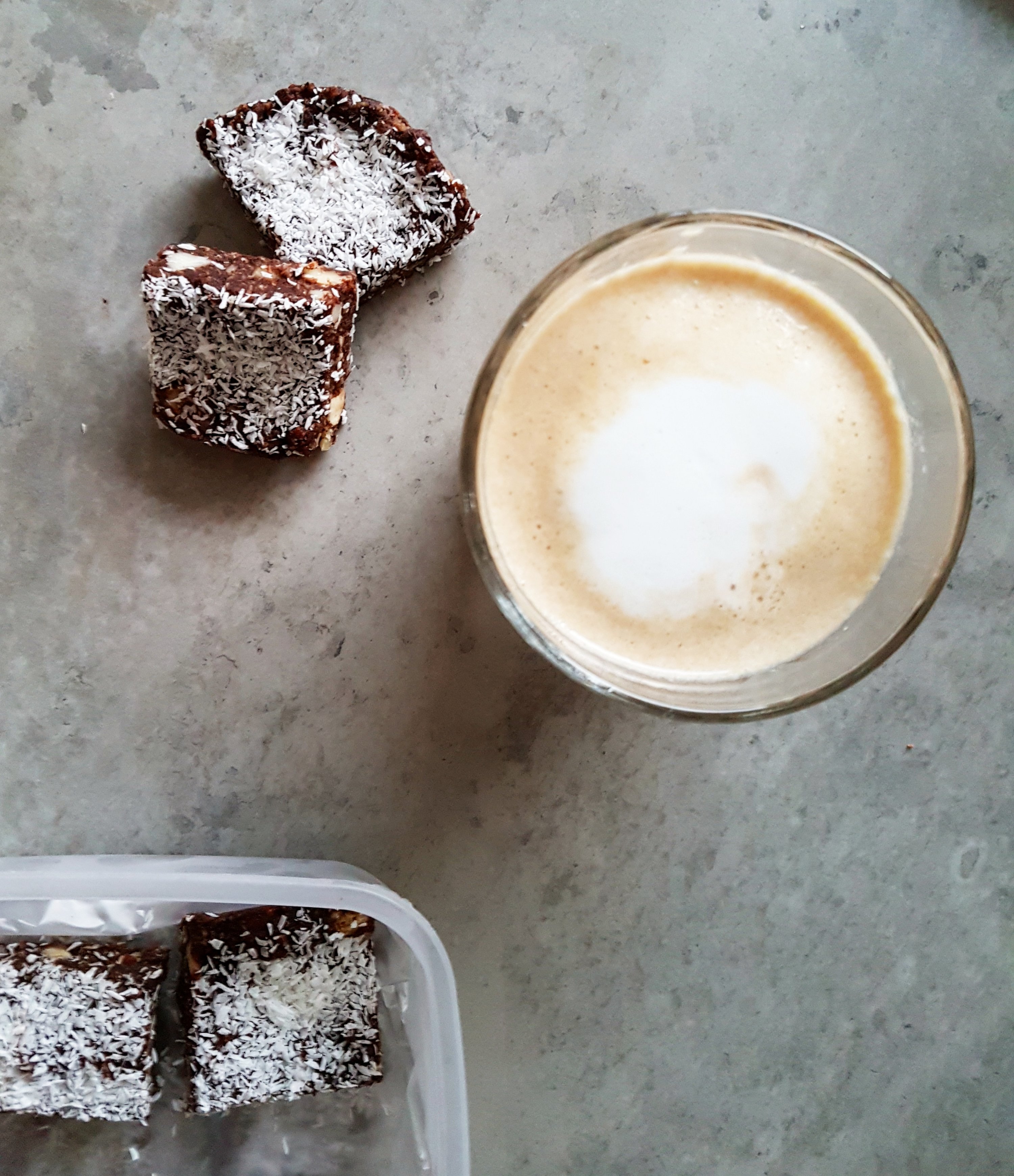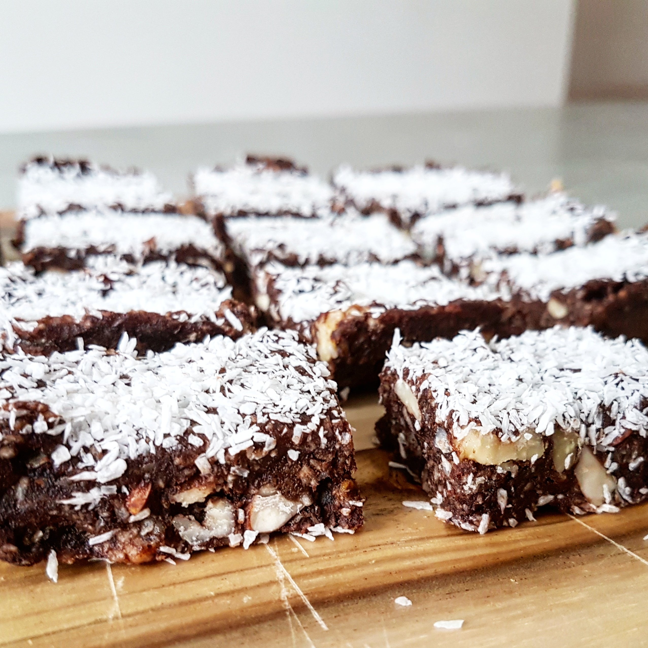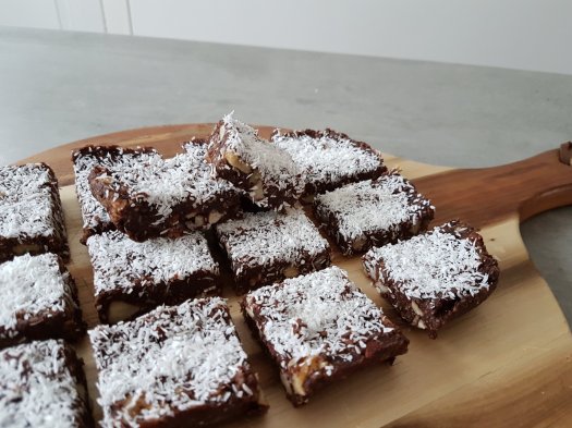 Pak een klein ovenschaal of een plastic bakje o.i.d. en leg hier plastic folie in (inclusief de zijkanten). Doe hier het mengsel in, druk goed aan en verdeel goed. Strooi er wat kokos overheen en plaats het in de koelkast voor ongeveer 3 uur. Daarna haal je de brownie uit de vorm en snijd je het stukjes. Strooi er kokos overheen en klaar om te serveren!