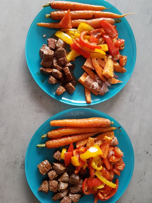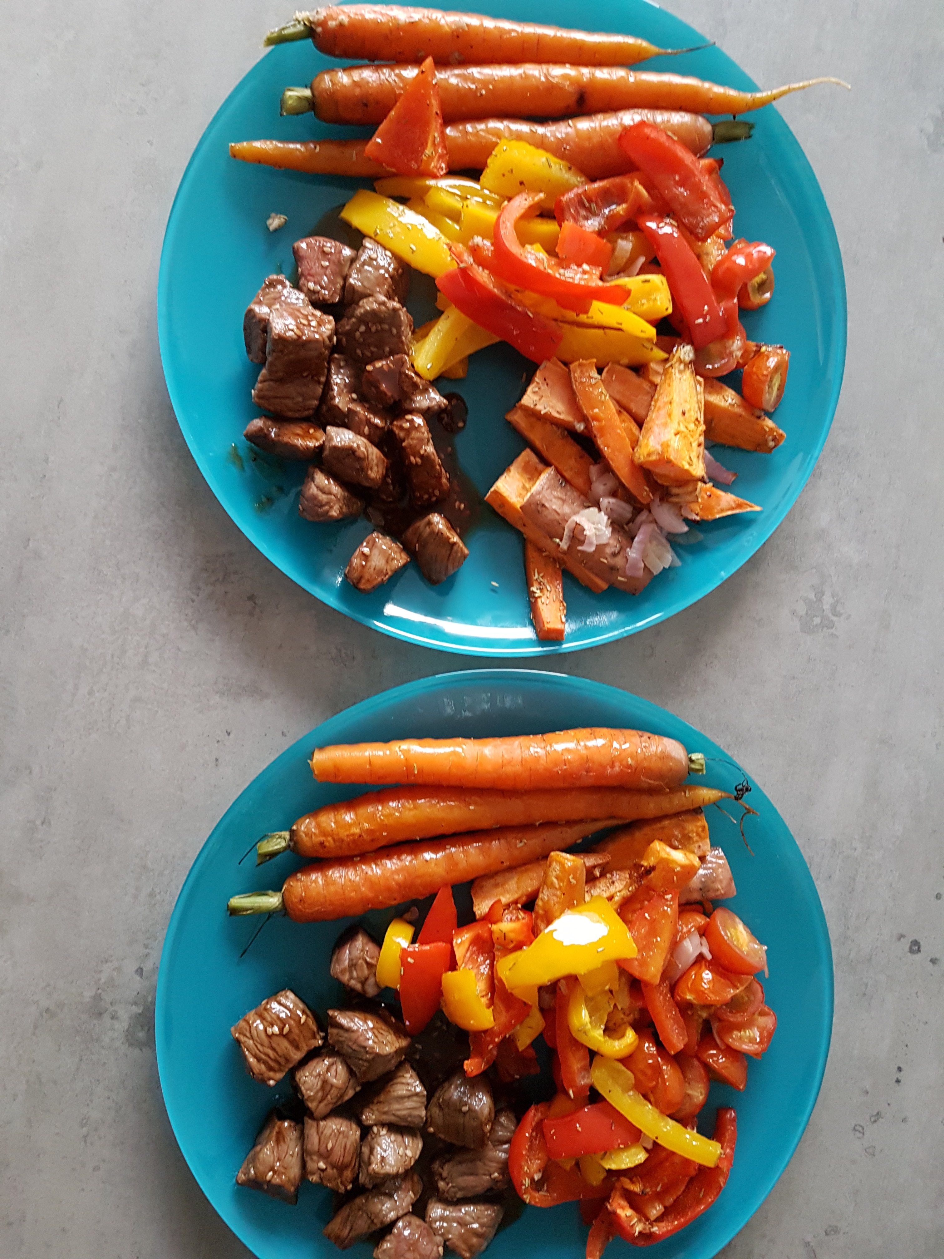 Groenten uit de oven, met een goede olijfolie en kruiden. Groenten uit de oven is zo makkelijk en het smaakt echt lekker, zelf vind ik het lekkerder dan wanneer ik het gekookt heb. Ik vind het belangrijk om dagelijks een flinke portie groenten binnen te krijgen. Het is gezond, vezelrijk, calorie arm en lekker! Daarnaast vinden we een stukje vlees ernaast lekker. Goede combinatie.