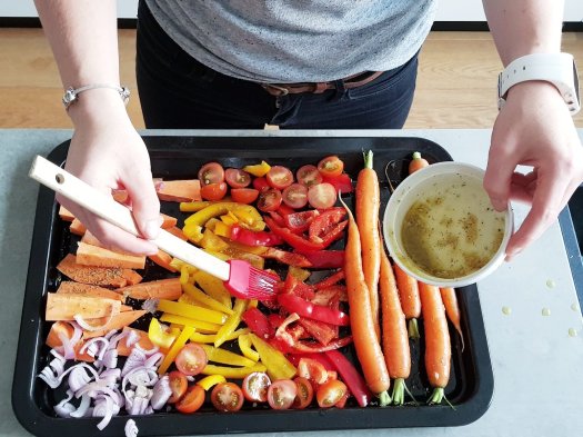 Pak een ovenschaal of ovenplaat en zet op het aanrecht. Leg hier de wortels op. Snijd de paprika in reepjes en leg naast de wortel. Snijd de cherry tomaatjes door de helft, de rode ui in reepjes en leg ook erbij. De zoete aardappel snijden we ook in repen, je hoeft deze niet te schillen! Leg ook bij de rest.