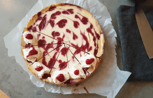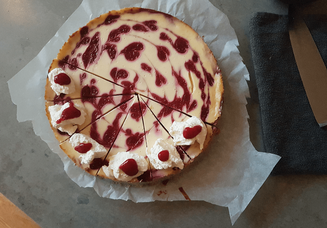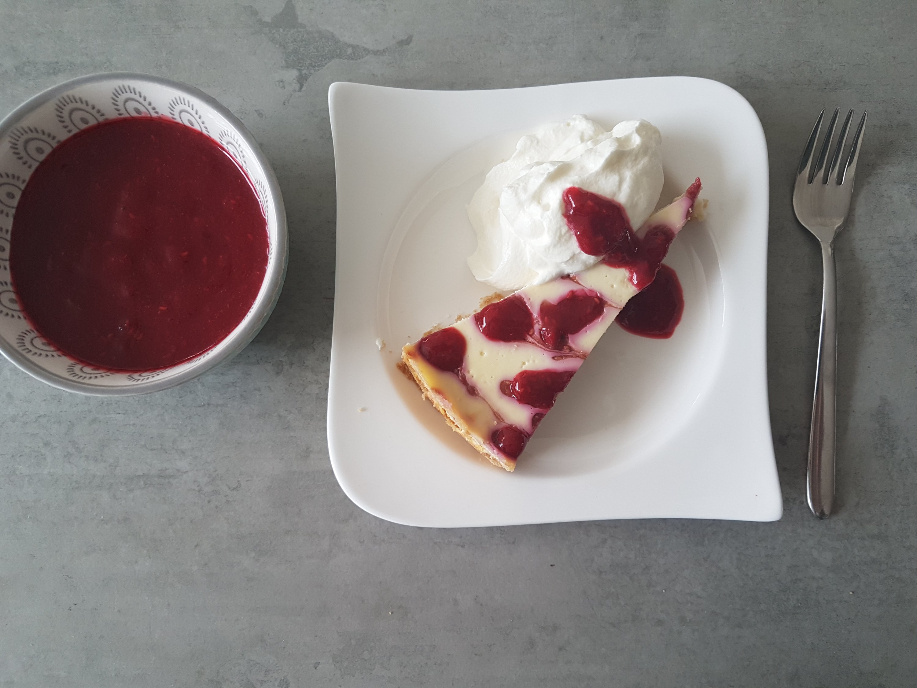Serveer de cheesecake met verse slagroom en frambozenmengsel!