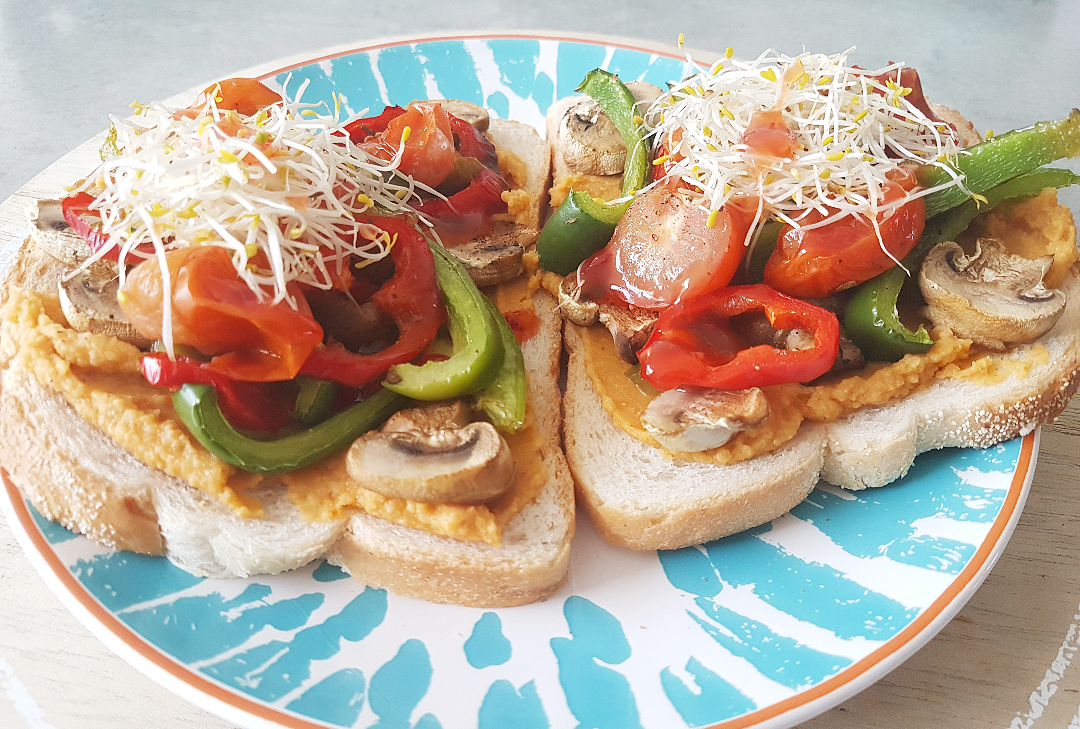 Besmeer de boterhammen met pompoenhummus. Verdeel de groenten erover. Snijd de japaleno pepers in kleine stukjes en verdeel ook. Doe op beide boterhammen een klein handje alfalfa.