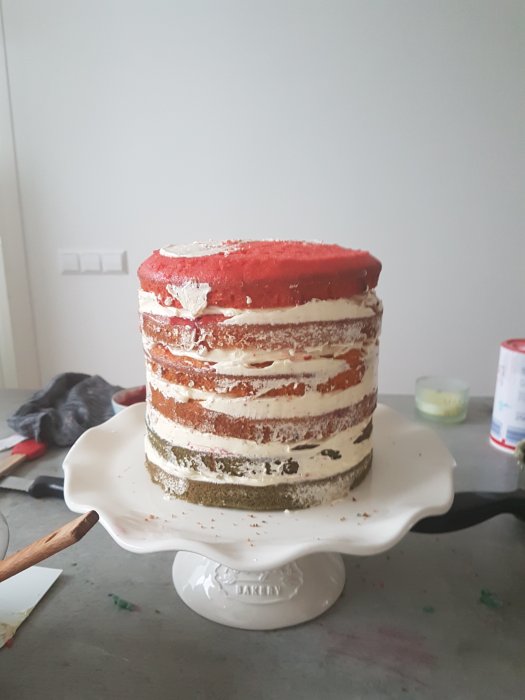 Ik ben begonnen met een paarse laag, een laagje jam erop en daarna de botercreme. Zo ben ik alle lagen af gegaan en eindigde ik met rood. De buitenkant werd oranje, de botercreme die ik over had heb ik door 2 verdeeld. 1 werd roze en het andere deel oranje. De buitenkant goed bedekt zodat je de lagen niet meer zag. Daarna de taart 30 minuten in de koelkast gezet zodat het kan opstijven.