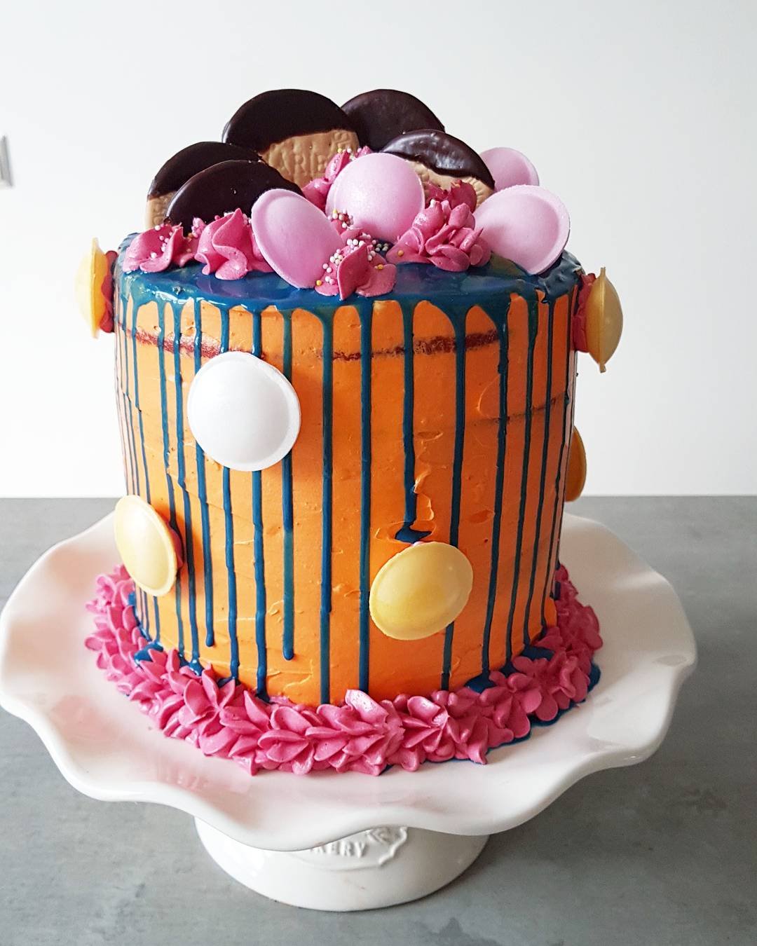 Een regenboogtaart met oranje buitenkant, een blauwe drip en verder mocht ik het zelf invullen! Aangezien een regenboogtaart of laagjes taart wel wat tijd kost ben ik vrijdag avond begonnen met het bakken van de lagen. De lagen moeten namelijk helemaal afgekoeld zijn voor je het gaat opmaken anders smelt de botercreme gelijk.