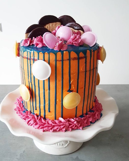 Ondertussen de drip gemaakt, witte chocolade genache met blauwe kleurstof, en die over de taart gedaan. De roze creme heb ik gebruikt om toefjes te maken onderin en bovenop. Ook heb ik wat biscuitjes gedipt in gesmolten chocolade, ufo’s (ben er zelf niet gek op maar staan super leuk). Mijn ouders kwamen in de middag de taart ophalen, ik had gelukkig net de keuken schoon want dat is wel een drama met dit soort projecten. Overal kleurtjes en vette vingers!