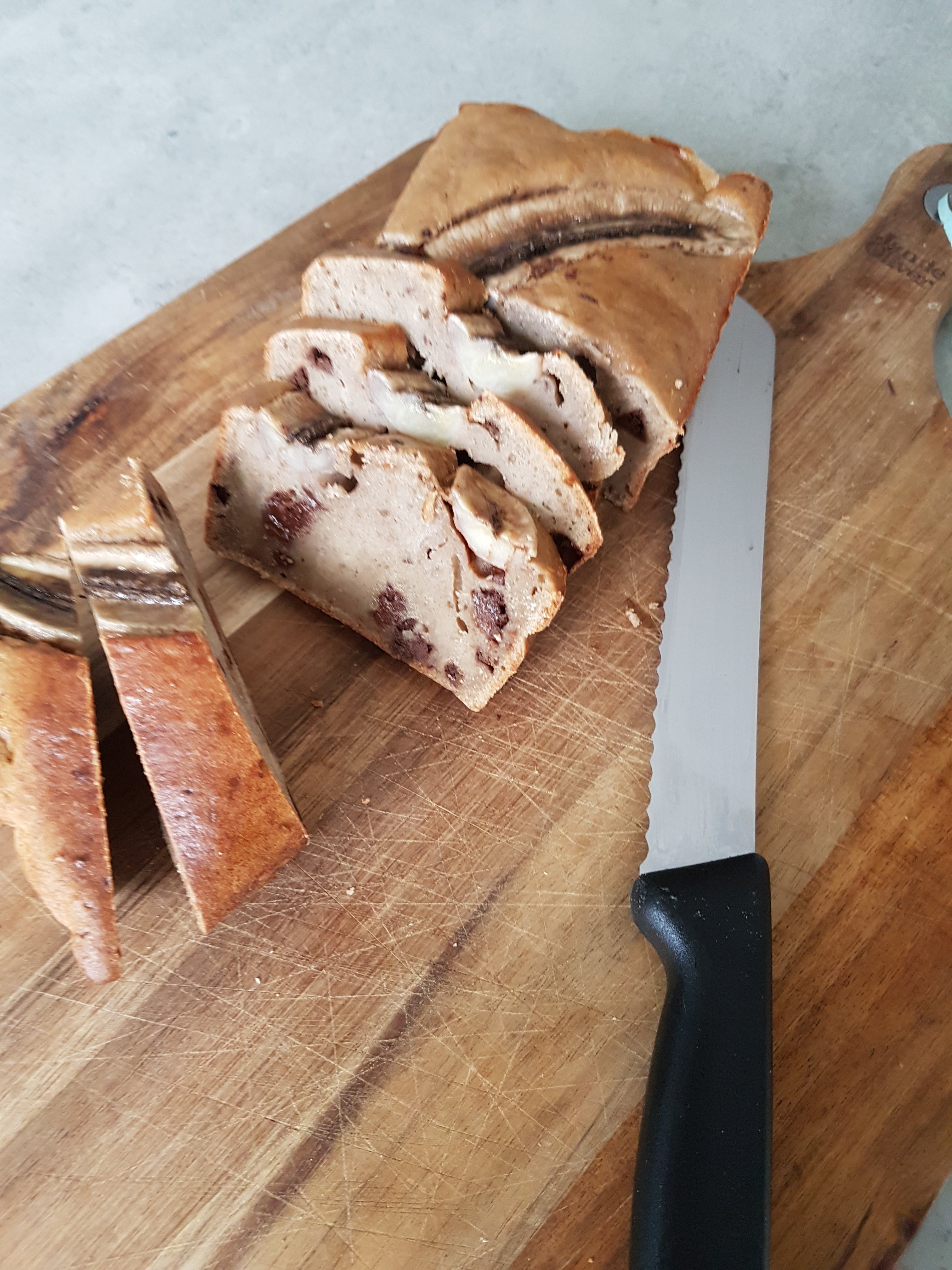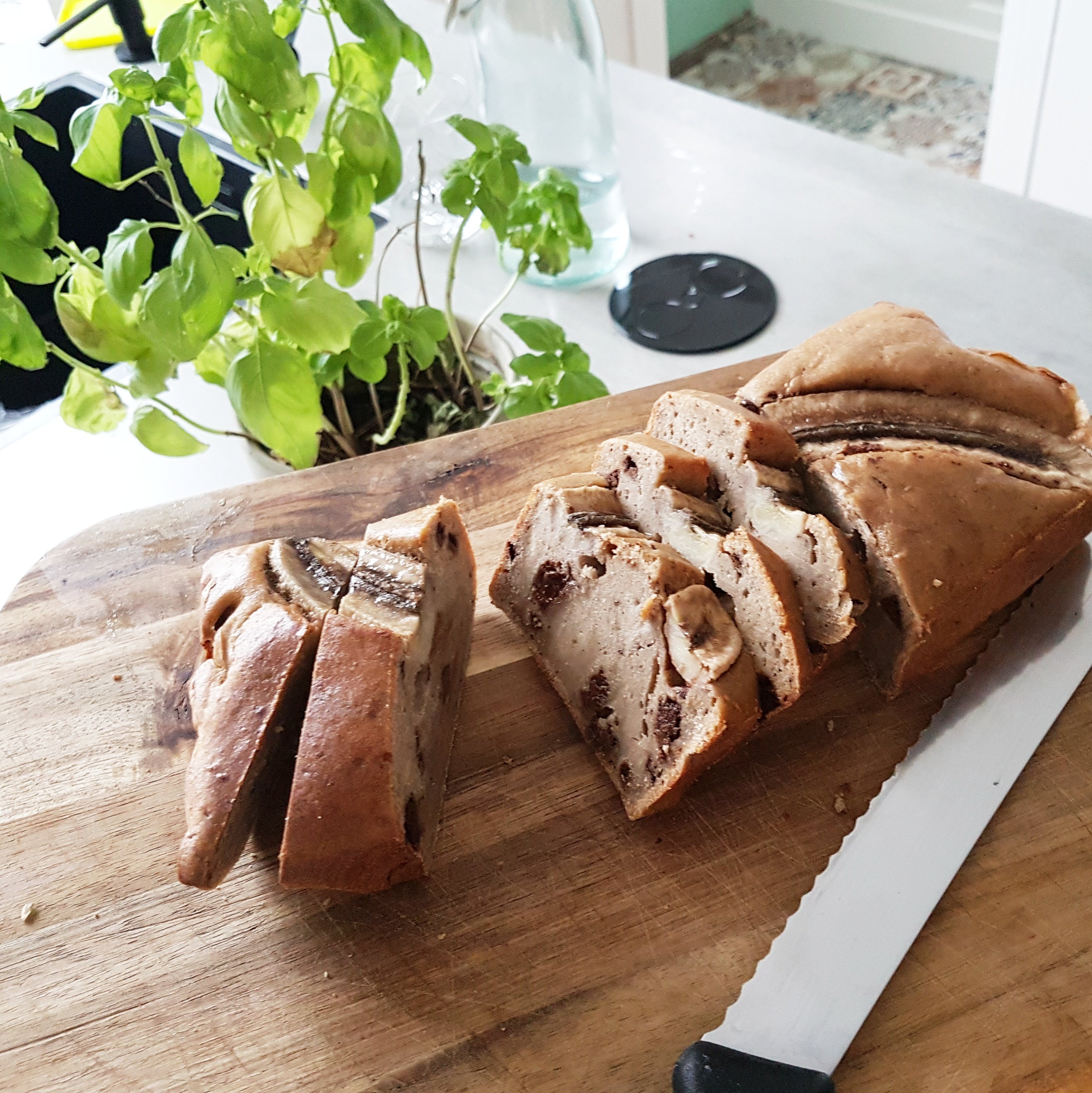 Zet de cake in de oven voor 55 minuten. Laat het bananenbrood afkoelen. Je kunt er voor kiezen om een klein beetje pure chocolade te verwarmen zodat je een chocolade sausje eroverheen kan gieten. Maak er een feestje van en geniet!