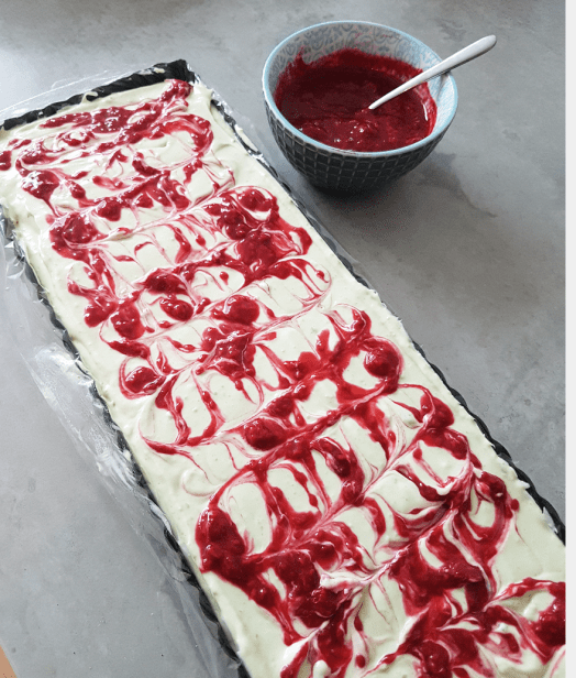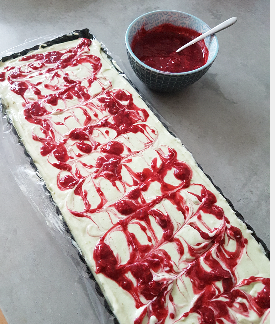 Schenk het mengsel in de vorm. Schenk de frambozen saus over het mengsel. Ik deed dat met een lepel, beetje verdelen over de taart. Daarna met een sateprikker van links naar rechts erdoorheen. Dan krijg je een ‘swirl’  effect. Plaats de taart in de koelkast voor minimaal 3 uur.