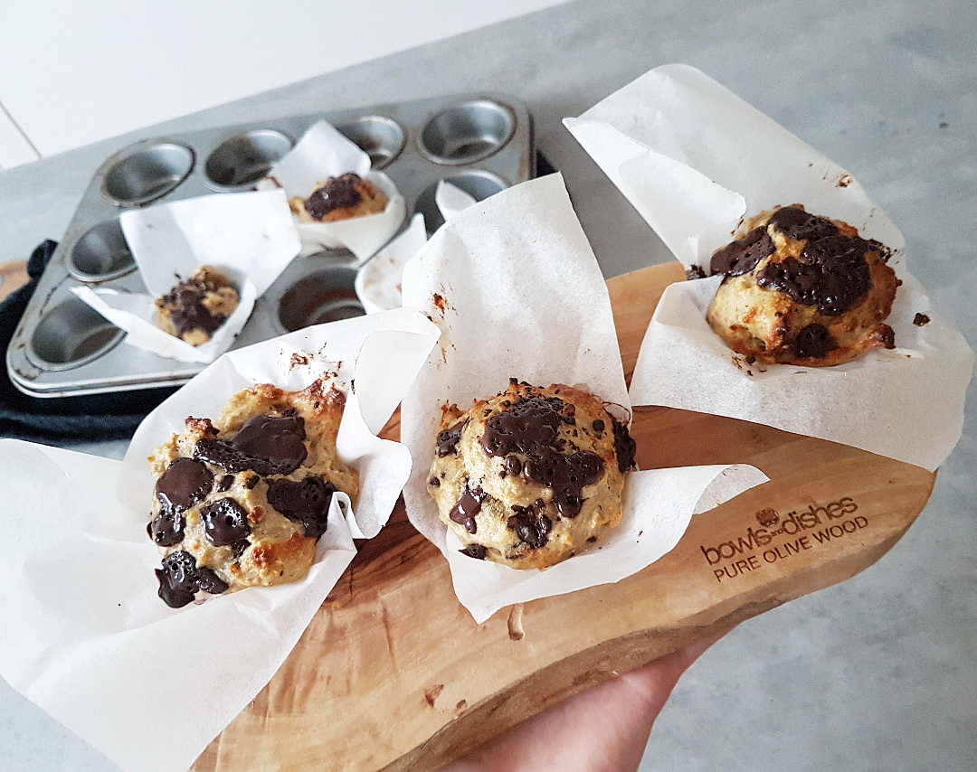 Snijd de chocolade in kleine blokjes en voeg 2/3e toe aan het beslag. Pak een muffin blik en doe in 6 vormpjes een muffin papiertje (ik gebruikte bakpapier). Verdeel het mengsel over 6 vormpjes en strooi de laatste chocolade snippers over de vormpjes.