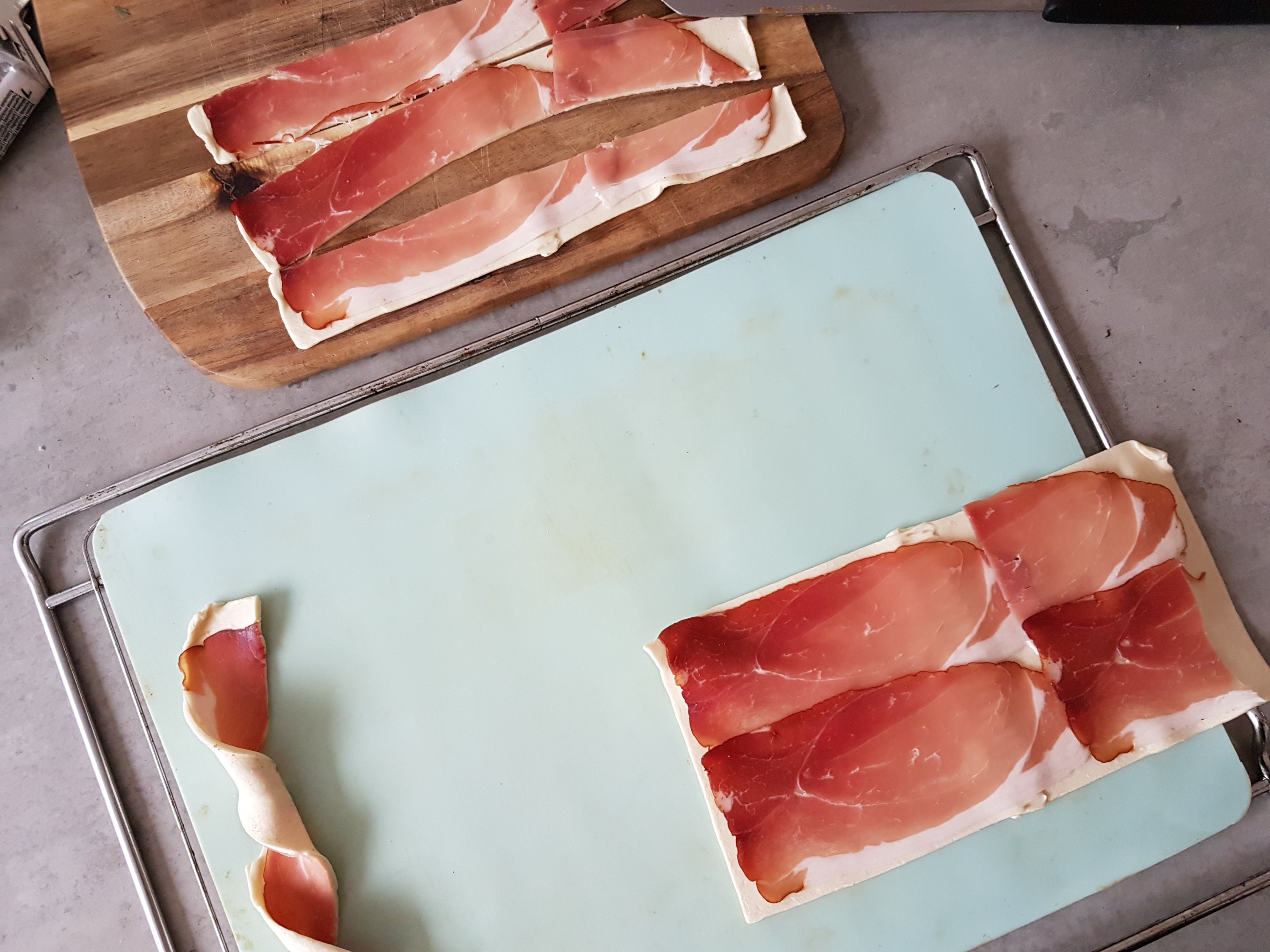 Leg de plakken bladerdeeg op bakpapier. Om een lang bladerdeeg te maken, maak je 2 plakken aan elkaar. Als het bladerdeeg ontdooit is kan je met een vork de plakken aan elkaar maken. Je hebt dus 2 bladerdegen aan elkaar en dat 2 x. Leg op beide de plakken ham en snijd 4 stroken per bladerdeeg. Krul de stroken. Totaal heb je dus 8 stroken .