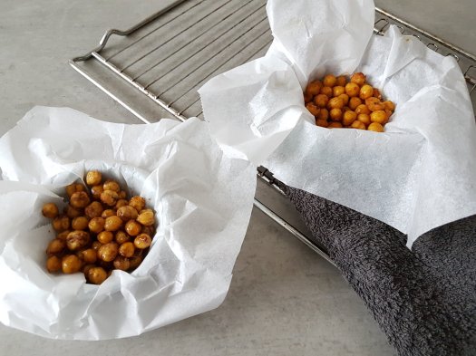 De snacks zijn klaar om te serveren! Zelf vind ik de geroosterde kikkererwten net uit de oven het lekkerst. Na een paar uur worden ze iets minder knapperig. Wil je ze dus serveren terwijl je visite hebt? Kruid ze van te voren en plaats in de oven als ze visitie er al is.