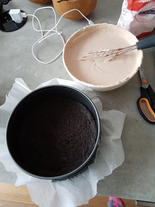 Maal ondertussen de Oreo koekjes, ik doe dit in een keukenmachine maar als je die niet hebt kun je het ook in een plastic diepvries zakje en met de deegroller overheen. Smelt de roomboter en meng dit met de gemalen Oreo koekjes. Vet de springvorm in of leg bakpapier in de springvorm. Verdeel de Oreo koekjes over de bodem en druk aan met de bolle kant van een lepel.