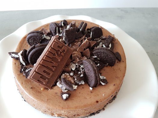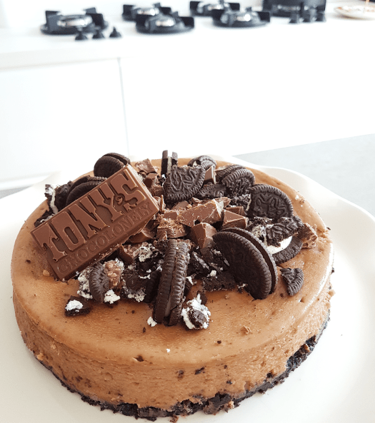 Plaats in de oven voor 60 minuten. Na de 60 minuten laat je de cheesecake afkoelen in de oven. Na een half uur haal je hem rustig uit de oven en laat je hem een uur afkoelen op het aanrecht. Daarna minimaal 3 uur in de koelkast. Versier daarna de cheesecake met de overige Tony Chocolonely reep en oreo koekjes.