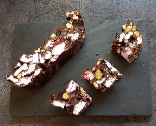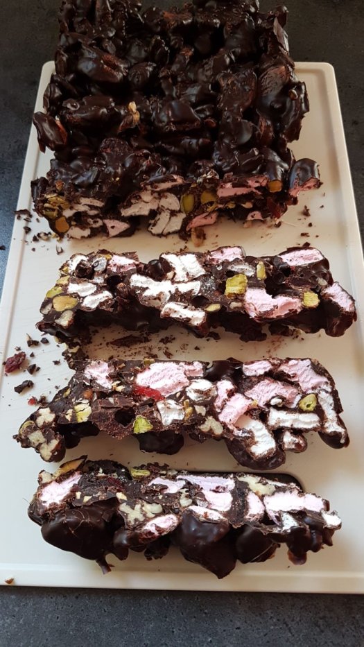 Goed, we gaan naar het recept want door de chocolade te combineren met noten en vruchten is de kans groter dat je het lekkerder vind.