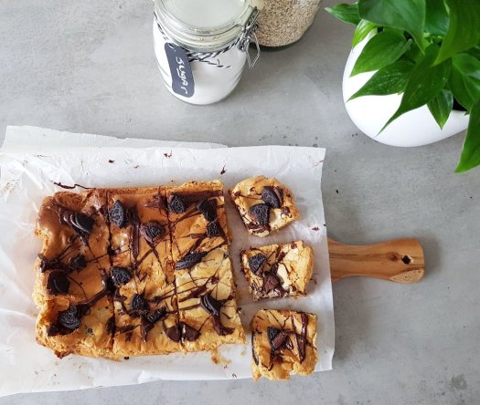 Ik heb de blondies gemaakt in een kleine ovenschaal, daarna vierkantjes van gesneden zodat je het makkelijk op een schoteltje kunt leggen voor bijvoorbeeld visite. Dus als je een keer geen zin hebt om een grote taart te bakken maar toch iets lekkers en redelijk speciaal; maak dan blondies met bv. Oreo koekjes of eventueel andere lekkere koekjes!