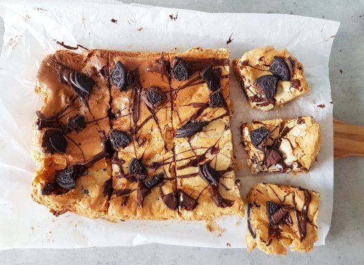 Blondies, ken jij ze al? Het zou me niet verbazen als je er nog nooit van hebt gehoord maar het is echt MEGA lekker! Het is chocolade brownie maar dan met witte chocolade. Klinkt dat niet hemels? En dat in combinatie met gesmolten chocolade en Oreo koekjes #tegek!