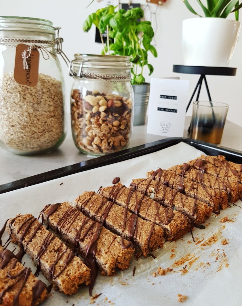 Om de reep een beetje te pimpen & een extra lekkere smaak aan te geven heb ik wat pure chocolade au bain marie gesmolten en eroverheen gedaan. Wie wilt er nou geen chocolade….!?