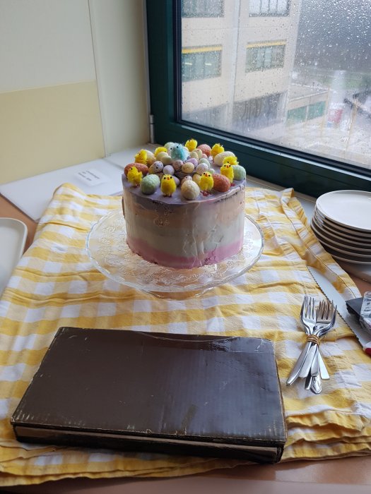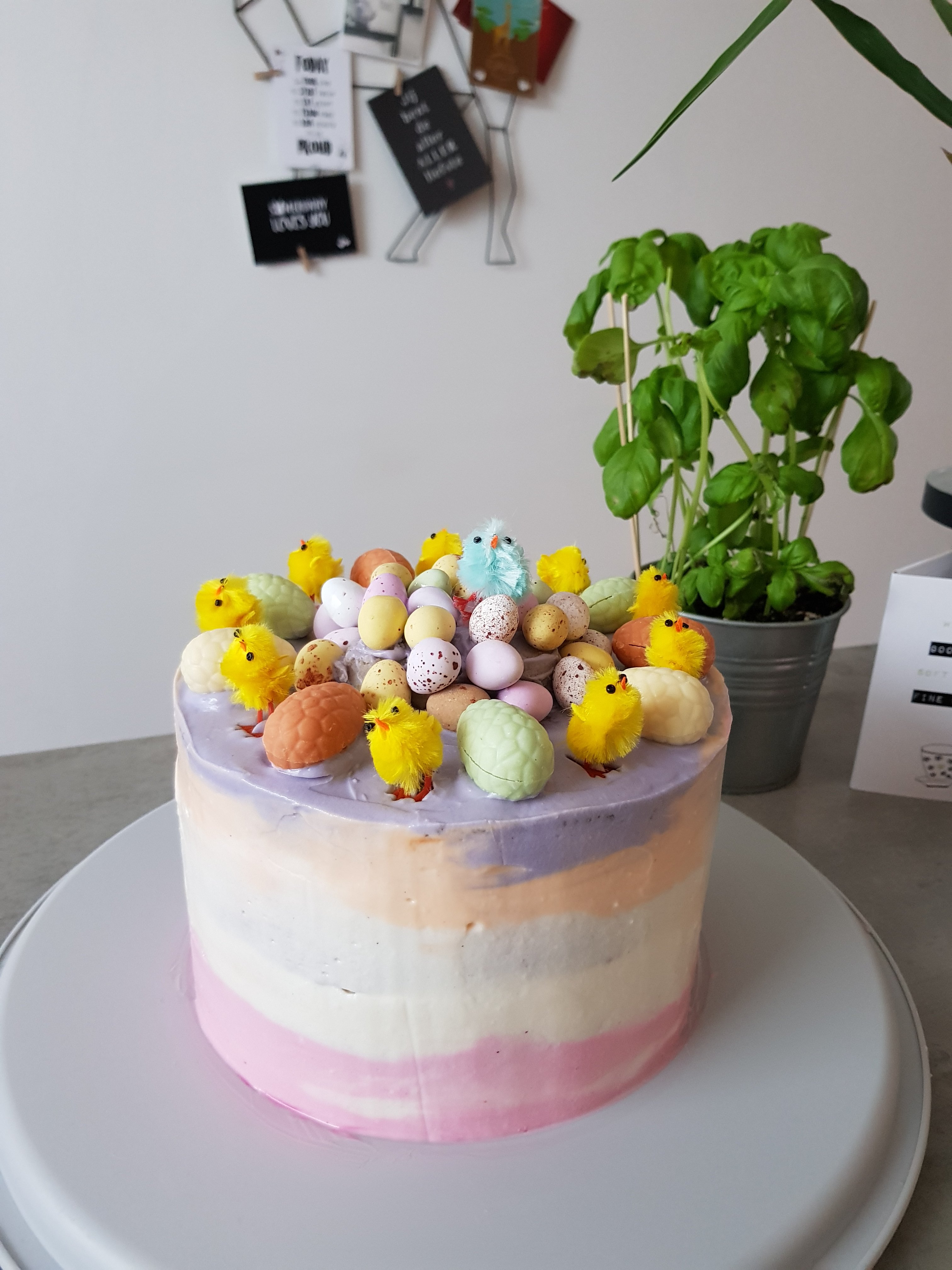 De paarse laag bovenop probeer je ook zo strak mogelijk te krijgen, daarna ga je versieren! Versier naar wens. Ik heb het met diverse paas eitjes gedaan en een paar grotere pasteitjes (waar alcohol in zat) en wat kuikentjes. De eitjes heb ik van een banketbakkerij en ze waren heeeerlijk!