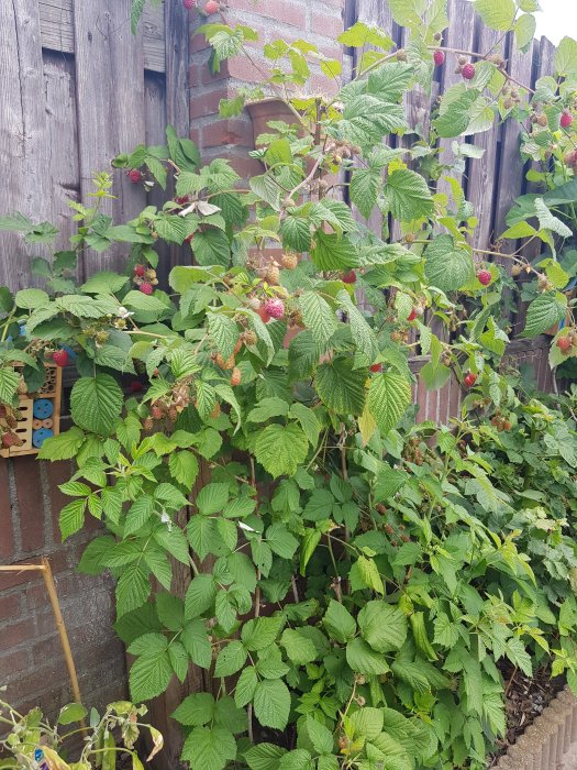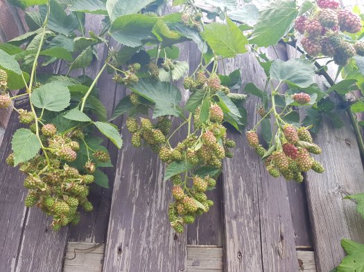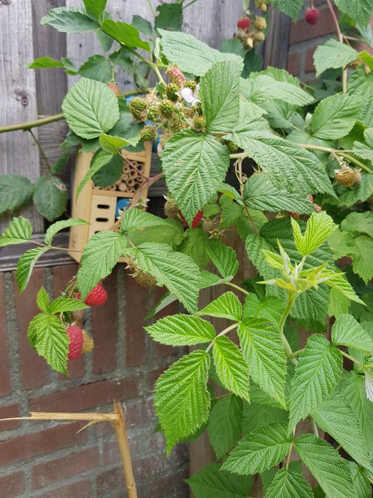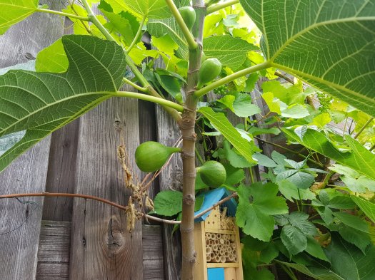 Op dit moment hebben we een aantal aardbei plantjes, een grote peren boom, klein paprika boompje, aubergine boompje, frambozenstruik en een flinke bramen struik, druivenstruik, rode en blauwe besjes, vijgenboom en 2 appel bomen. Binnen hebben we nog wat kruiden maar niet veel (sinds we een kitten hebben overleven niet alle planten het dus liever even mee wachten ;-)).