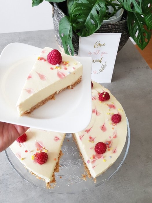 Stamp de 5 frambozen fijn met 1 el water, je kan het ook eventueel een klein beetje opwarmen. Ik heb het gezeefd zodat je alleen rode saus over houd en hiermee de hartjes swirl boven op gemaakt. Zet in de koelkast voor minimaal 3 uur. Daarna kun je de no bake cheesecake afmaken met frambozen en eventueel nog wat overige versiering.
