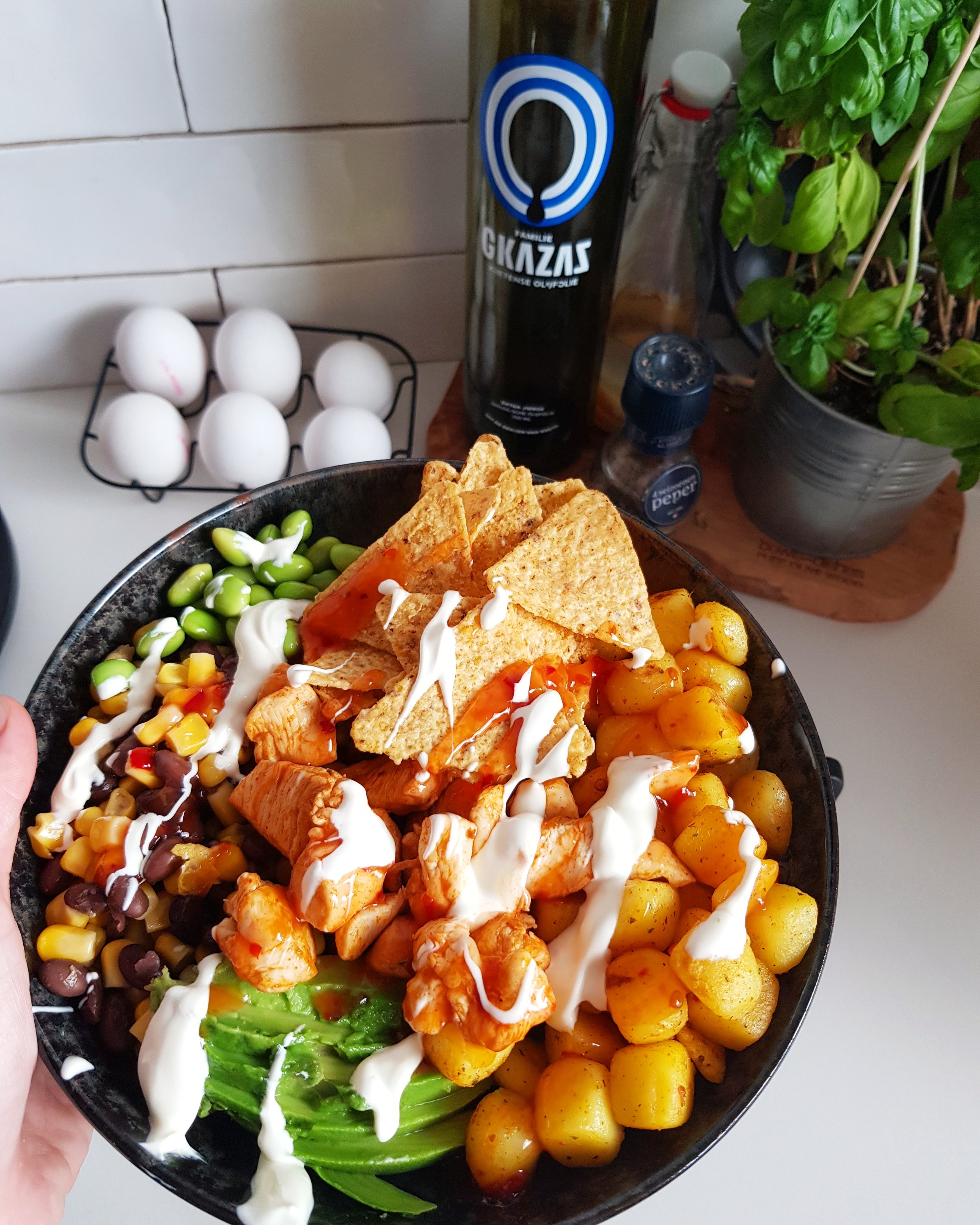 Bij deze Mexicaanse bowl hoef je alleen de kip en de aardappeltjes te bakken en de rest serveer je koud. Dit kun je voorbereiden wanneer je de kip aan het bakken bent. Ideaal voor als je een drukke week hebt of gewoon geen zin hebt om lang te koken!