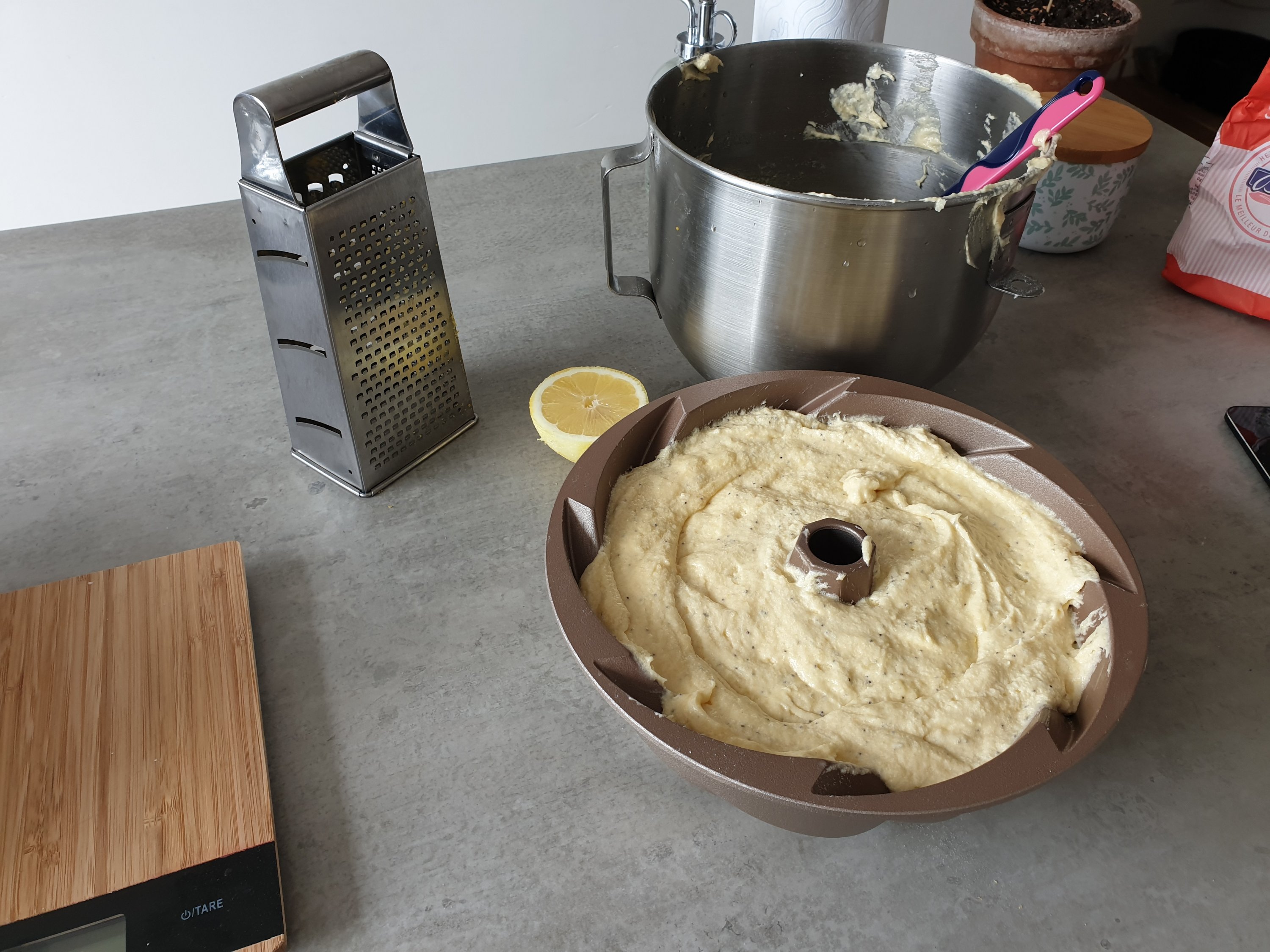 Als eerste snijd je de boter in blokjes en doe dit in een kom. Voeg de suiker toe samen met de rasp van de 2 citroenen. Klop het geheel romig. Voeg daarna 1 voor 1 de eieren toe en blijf tussendoor het geheel mixen. Voeg daarna beetje bij beetje het zelfrijzendbakmeel en het zout toe en zorg dat je eerst even rustig klopt anders heb je overal het meel zitten :-). Zet daarna de mixer iets harder zodat het een luchtig beslag wordt.