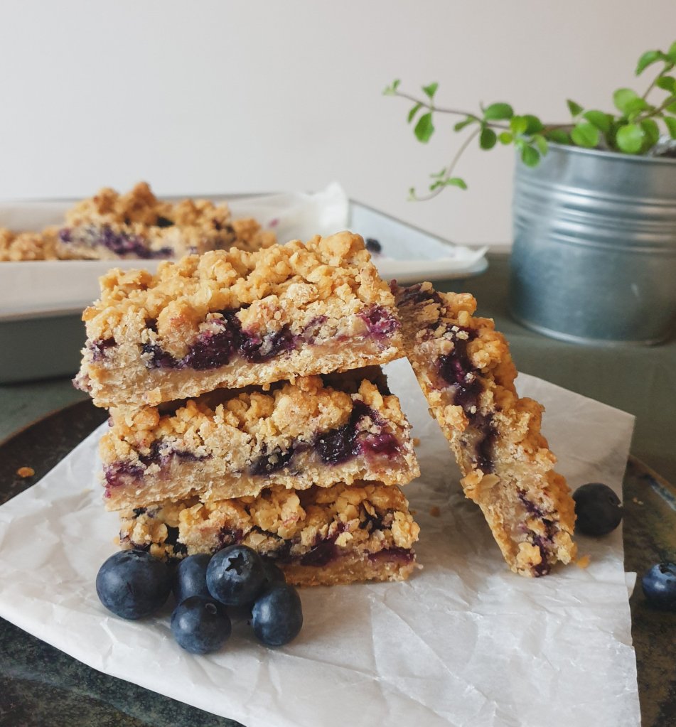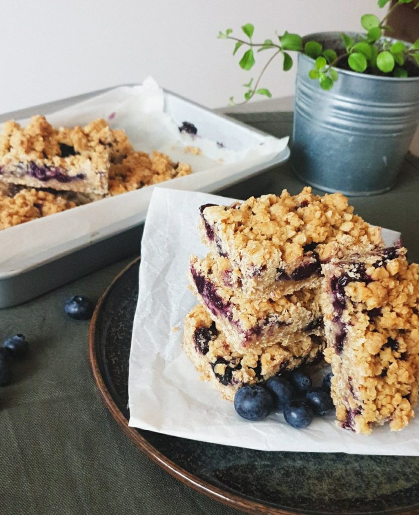 Meng de blauwe bessen met citroensap en suiker en leg dit over de het deeg heen. Gebruik het overige deeg als crumble boven op. Dit doe je het beste met je wijsvinger en duim om beetje kruimels te krijgen boven op.
