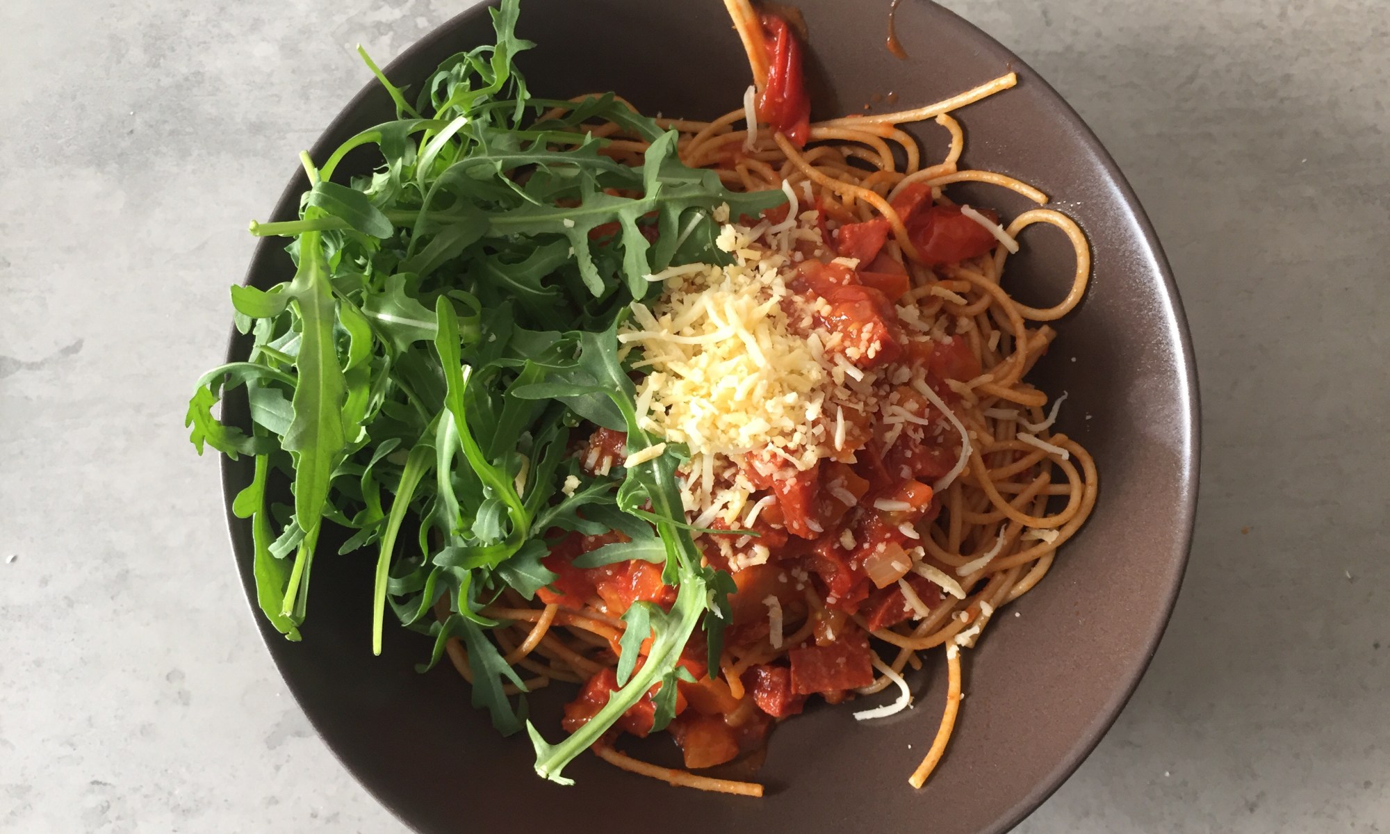 Spaghetti met chorizo, cherry tomaat en pesto
